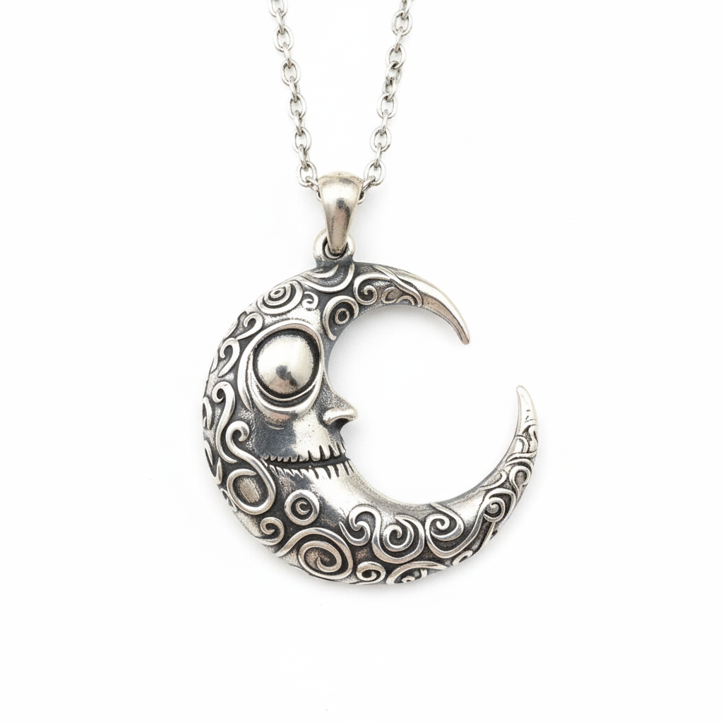 Darkly whimsical and unmistakably Gothic, the Crescent Moon Necklace merges lunar mystique with the fantastical charm of Tim Burton–inspired design. Handcrafted in 925K sterling silver, this pendant captures the enigmatic beauty of the night sky, suspended elegantly on a matching silver chain for durability and timeless style.