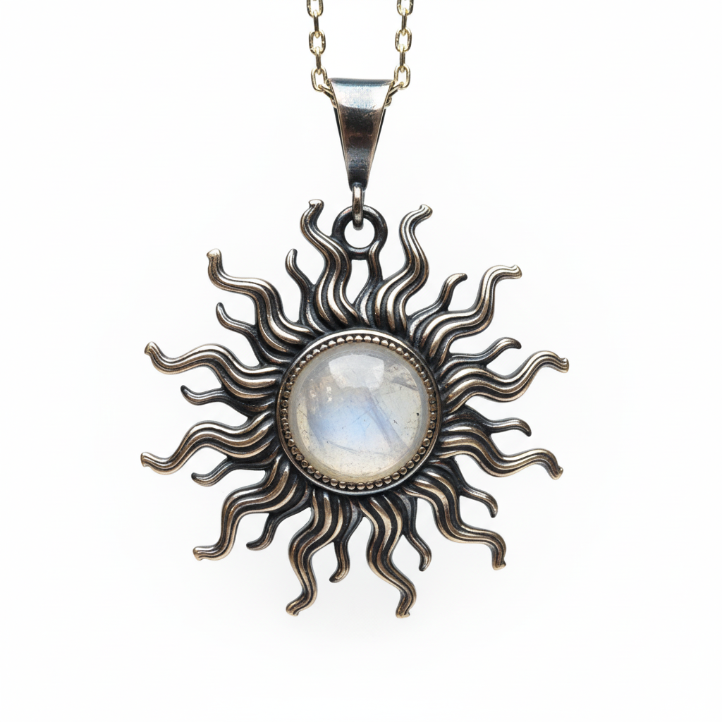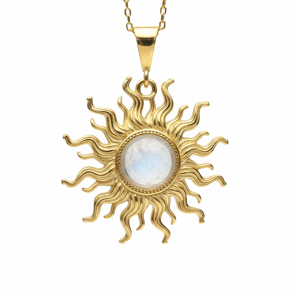 Embrace the mystical glow of dawn and the promise of transformation with the Fairy Sun Necklace—a luminous creation that blends celestial symbolism with nature's quiet magic. Handcrafted in 925K sterling silver and finished in soft gold, this piece channels the energy of new beginnings through the mesmerizing presence of a rainbow moonstone, a gemstone celebrated for its deep connection to intuition, emotional clarity, and vitality.