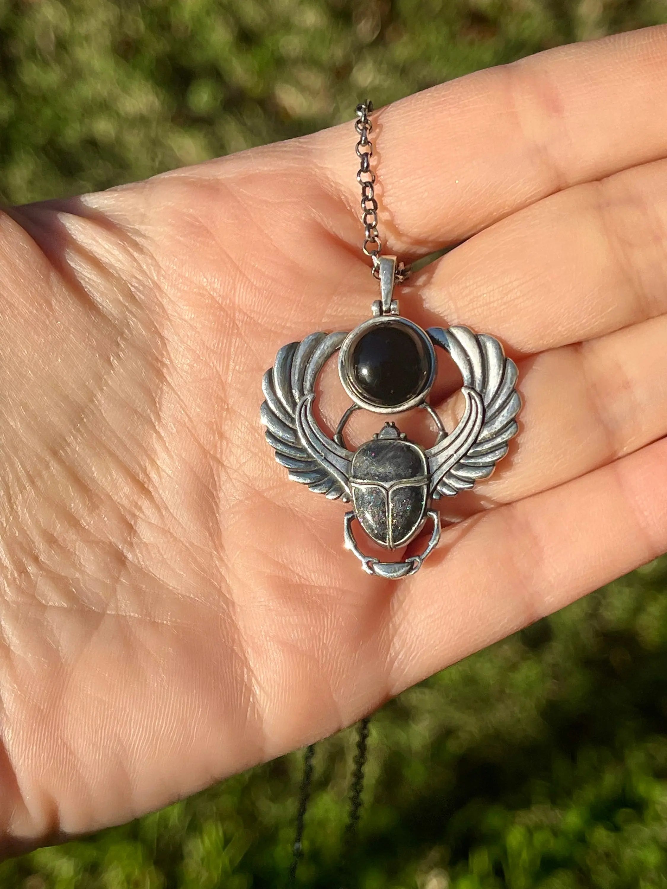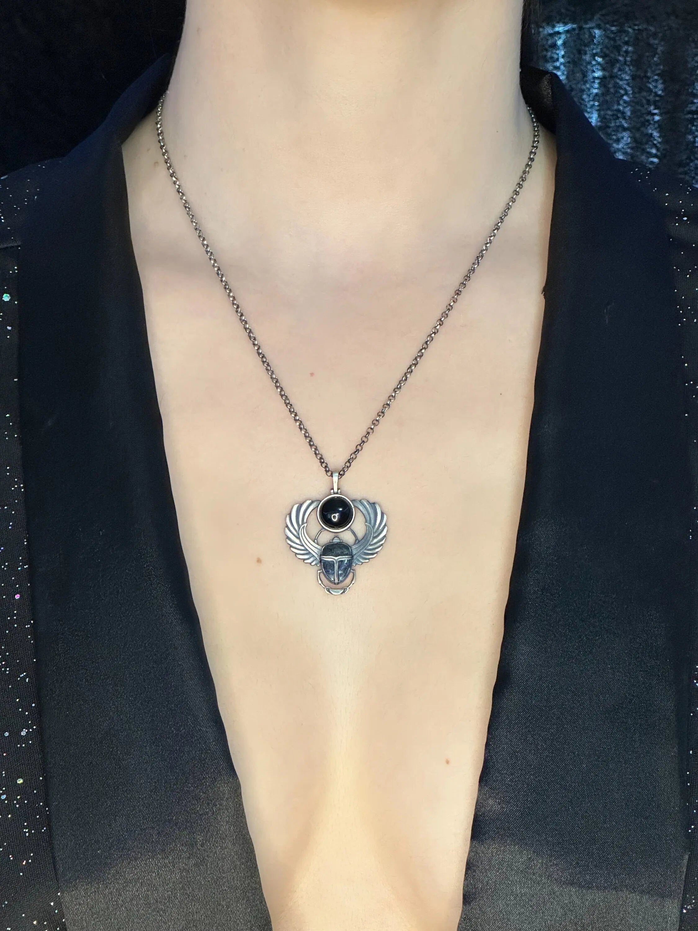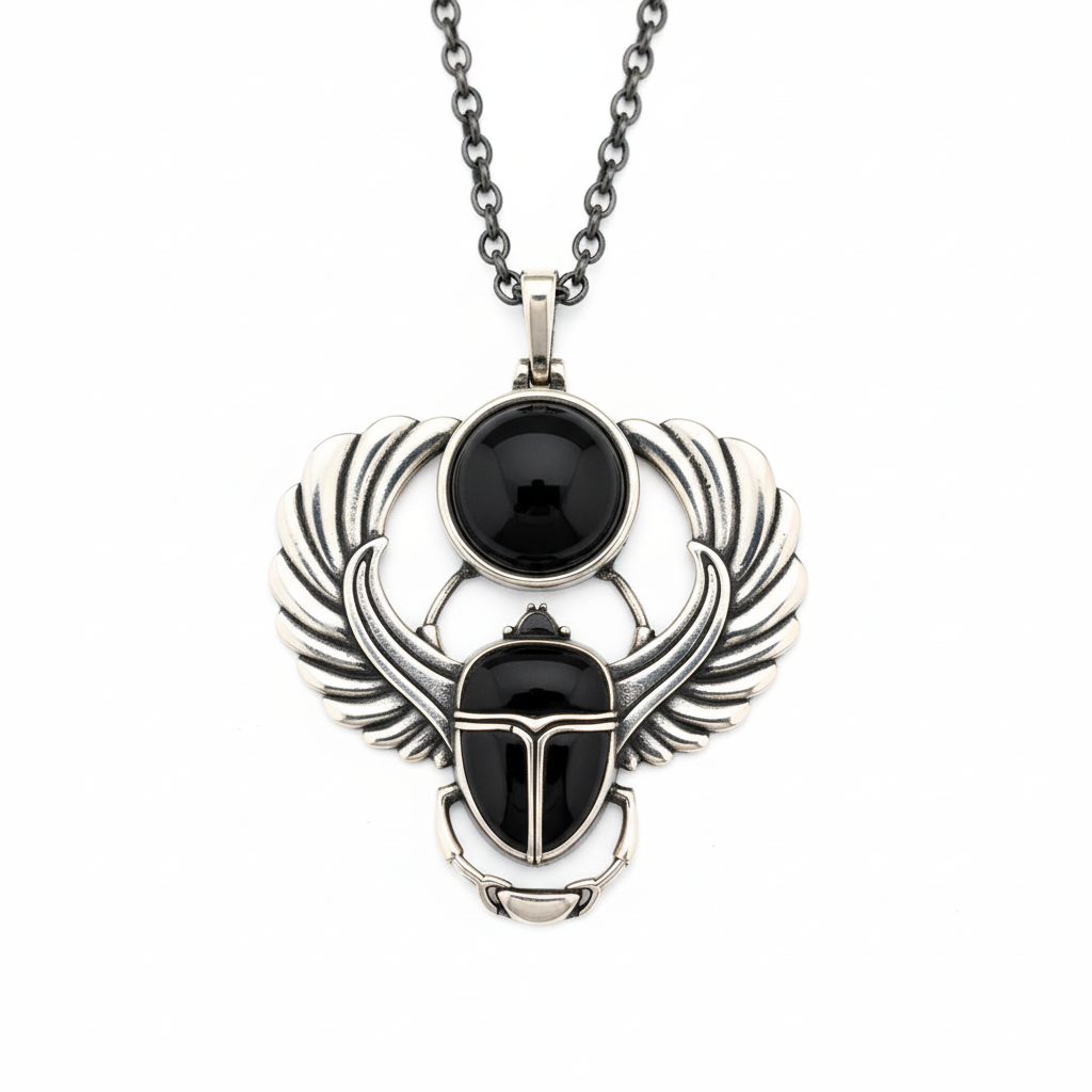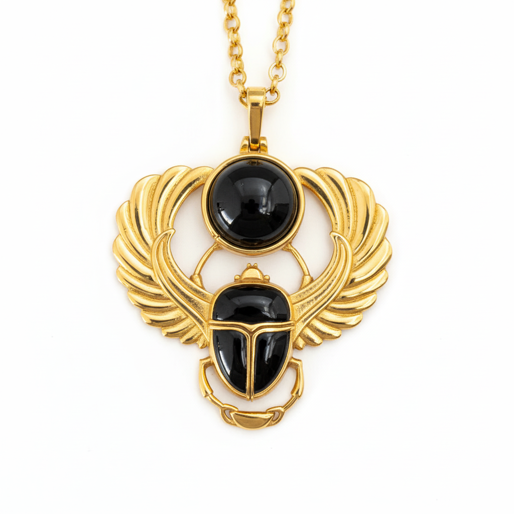 The Ancient Scarab Necklace artfully marries the potent symbolism of the Egyptian scarab with the protective properties of black onyx. In Egyptian mythology, the scarab, a symbol of rebirth and transformation, was revered as a guardian for the journey to the afterlife and a representation of the sun god Ra. Complementing this, the black onyx stone is celebrated for its grounding and shielding attributes, historically cherished for its role in releasing negative emotions and enhancing inner strength.
