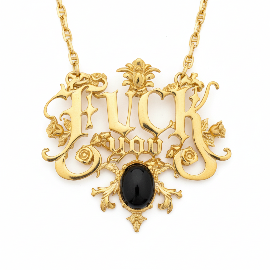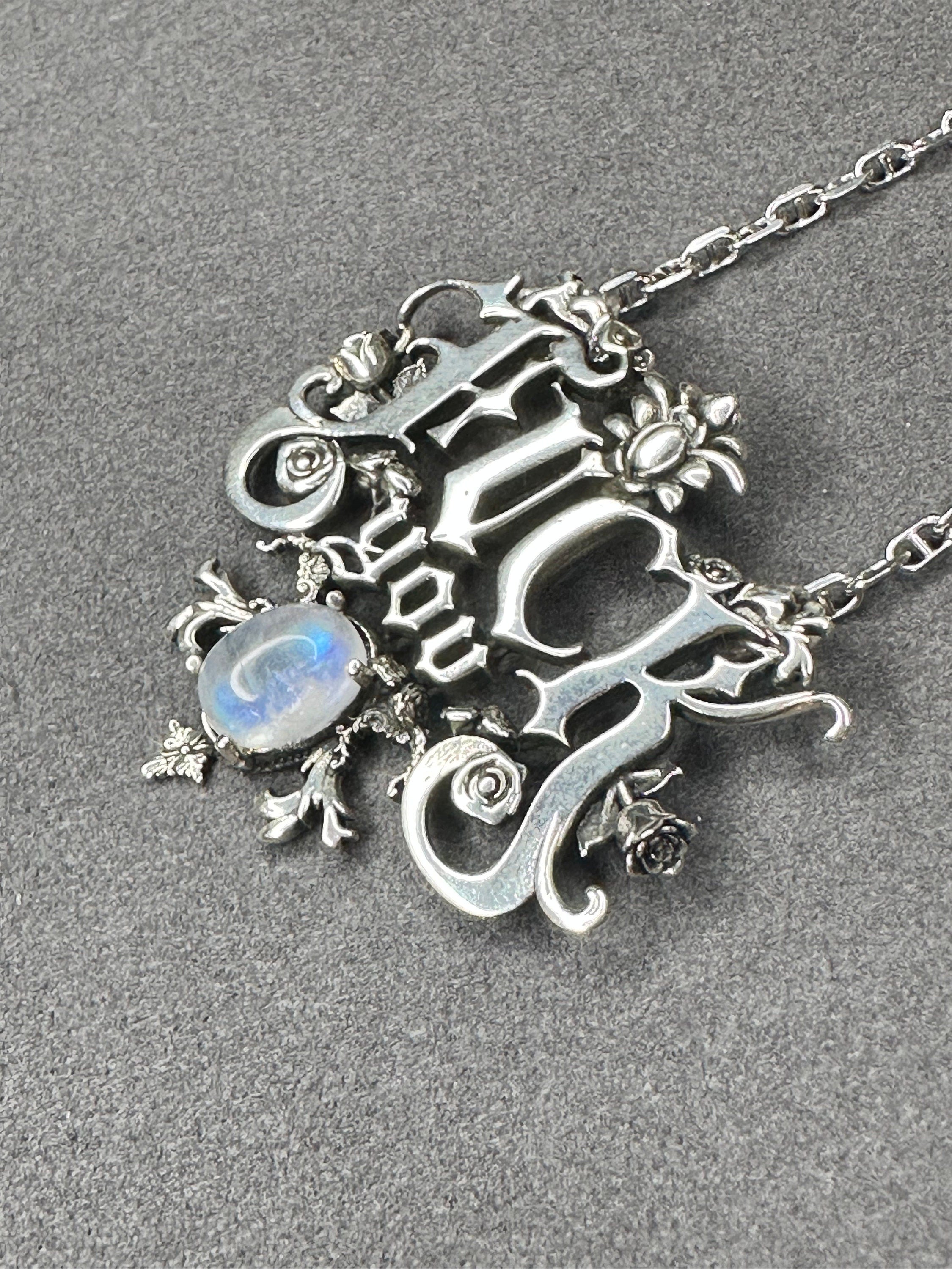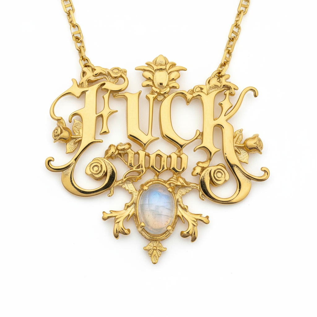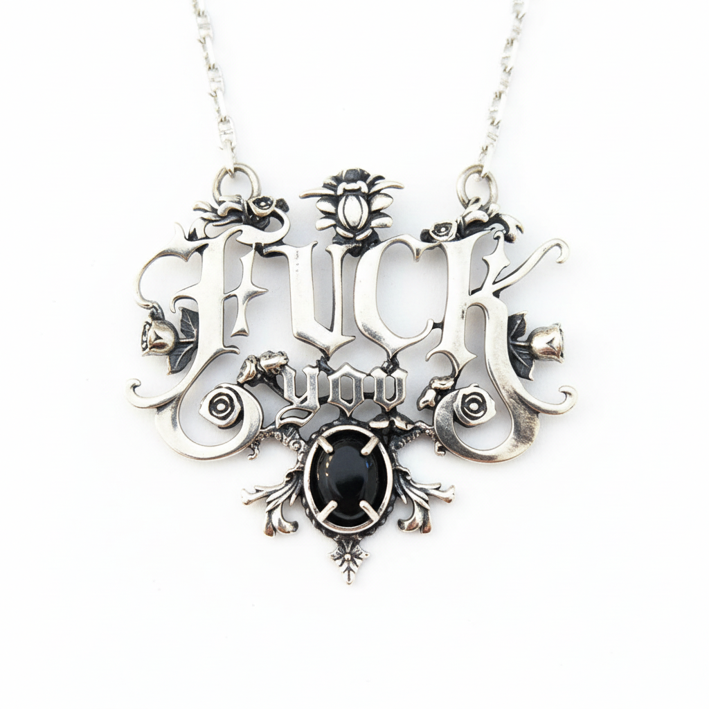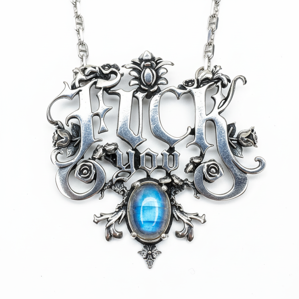 Bold yet elegant, the FUCK YOU Necklace is a striking creation that speaks without words. Crafted from 925K sterling silver, this pendant features powerful lettering in a vintage Gothic font, radiating strength and timeless beauty. At its heart rests a luminous moonstone, celebrated for its calming glow and connection to intuition, while detailed silver roses frame the design—symbols of both delicacy and resilience.